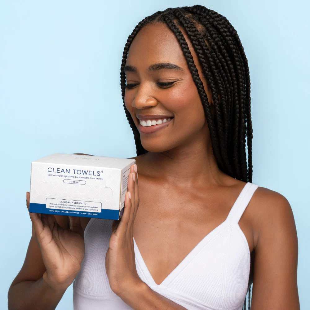 Want to see improvement in overall skin health? Ditch your regular towel or wash cloth and use Clean Towels disposable face towels instead. 25 Dermatologist-approved single-use face towels. Clinically shown to improve your skin barrier*